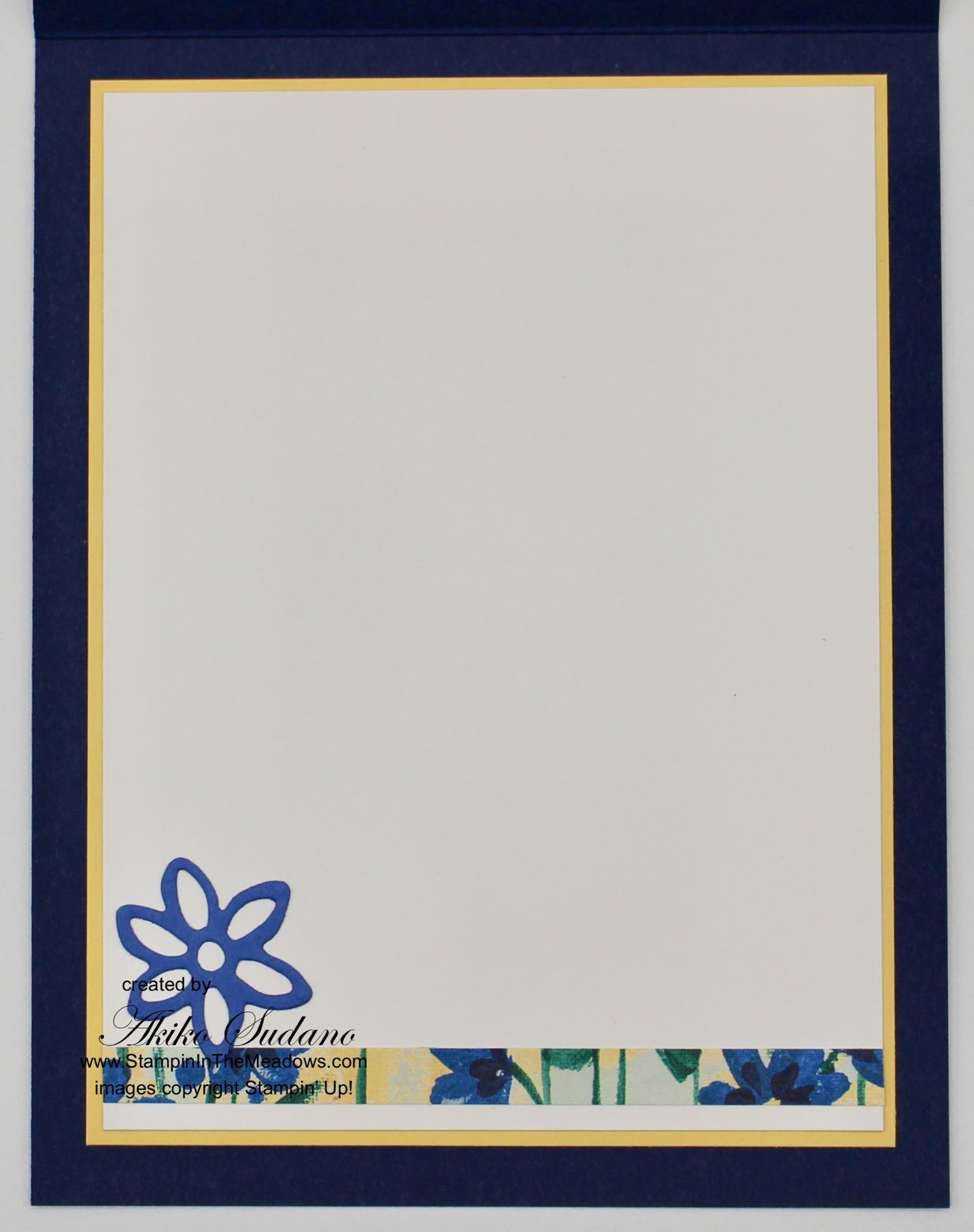 For the inside of the card, I stamped the flowers and stems from the Lasting Joy photopolymer stamp set in Night of Navy and Boho Blue ink on a Basic White panel. I trimmed the bottom with a strip of Countryside corners DSP and adhered the panel to the inside of the card with Stampin’ Seal.