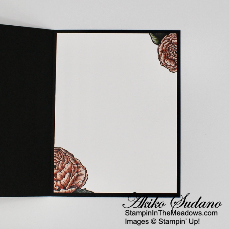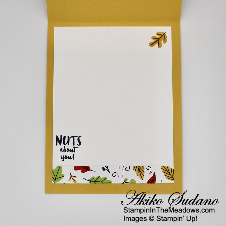 For the inside of the card, I stamped wildflower from the Stampin’ Up! Nature’s Prints stamp set in Wild Wheat ink in the corner of a Basic White panel. I adhered a strip of embossed Wild Wheat card stock to the bottom and adhered it to an Early Espresso mat. I adhered the layered panel to the inside of the card with Stampin’ Seal.