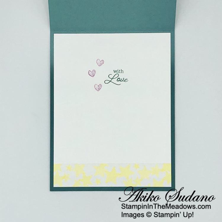 For the inside of the card, I stamped the sprig from the Stampin’ Up! Regal Flora stamp set using Bubble Bath ink in the corner of a Very Vanilla panel. I used my Blue and Fresh Freesia colored pencils to outline and accent the leaves and dotted the berries on the twigs with the Real Red colored pencil. This tied the sprig colors nicely to the DSP! I trimmed the side with DSP and adhered the panel to the inside of the card with Stampin’ Seal.
