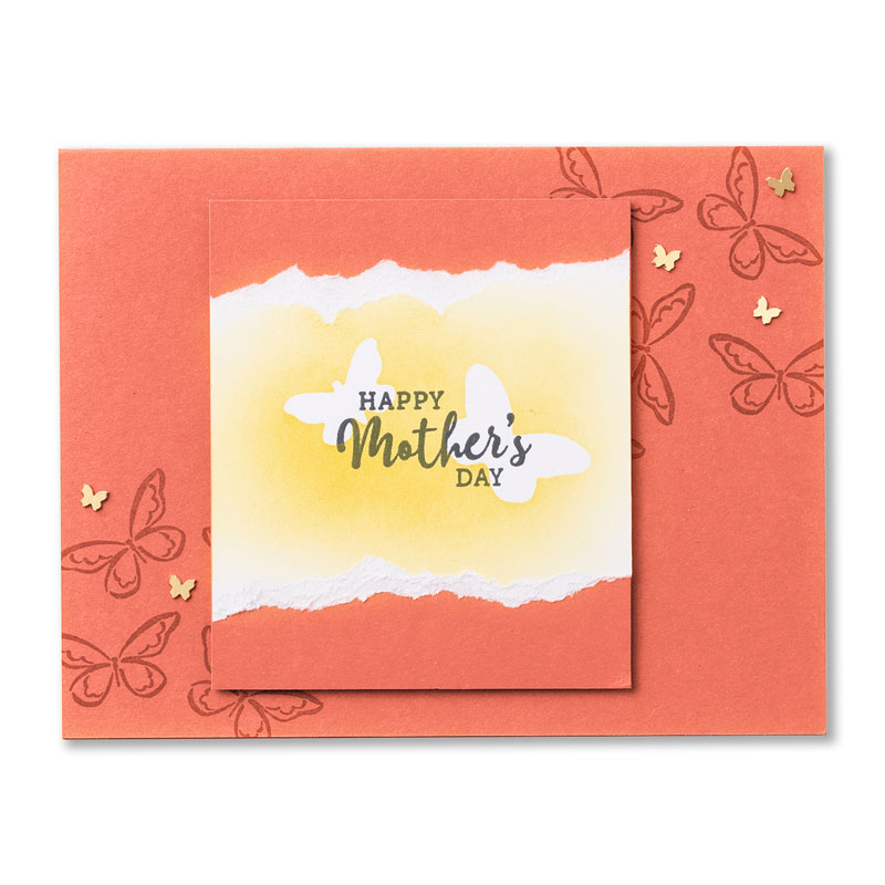 For the inside of the card, I stamped the sentiment from the Timeless Tulips stamp set in Polished Pink on a Basic White panel. I stamped the medium flower from the Stampin’ Up! Flowing Flowers stamp set in Pale Papaya in the corner of the panel and adhered the panel to a Pale Papaya mat. I adhered the panel to the inside of the card.