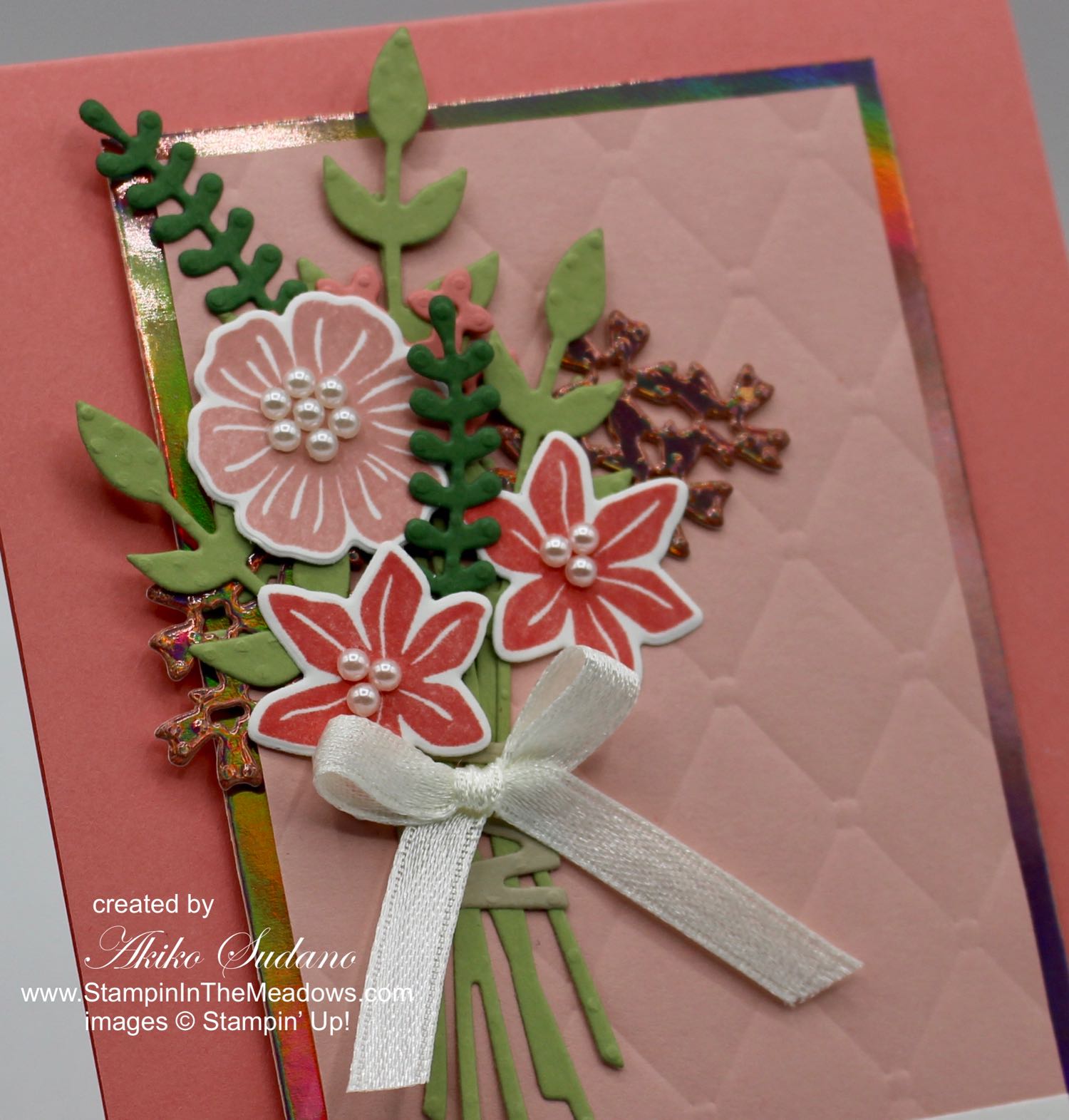 I stamped flowers from the Beautiful Bouquet stamp set in Flirty Flamingo and Blushing Bride and die cut them with their coordinating Bouquet Bunch dies along with some leaves from Pear Pizzaz and Garden Green. I die cut some flower clusters from the Grapefruit Grove foil for a little shine and arranged them in a little bouquet on the side of the Blushing Bride panel. I topped it off with a white satin bow and pearl accents for the flower centers.