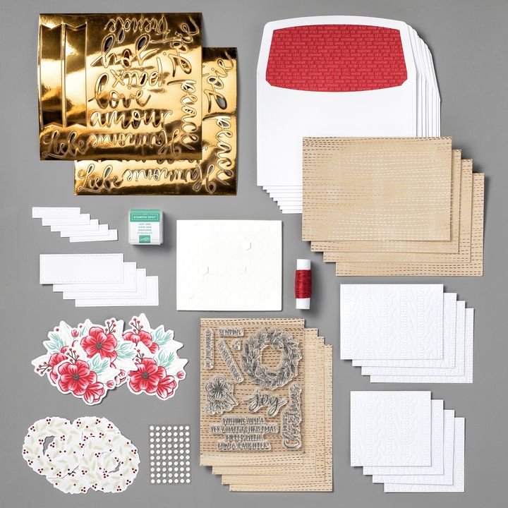 - The kit’s contents include printed card bases, die-cut paper pieces, embellishments, adhesive, and more!