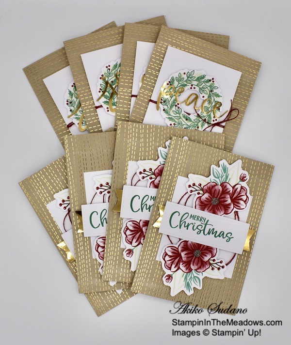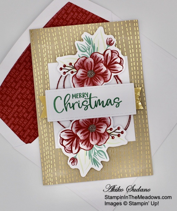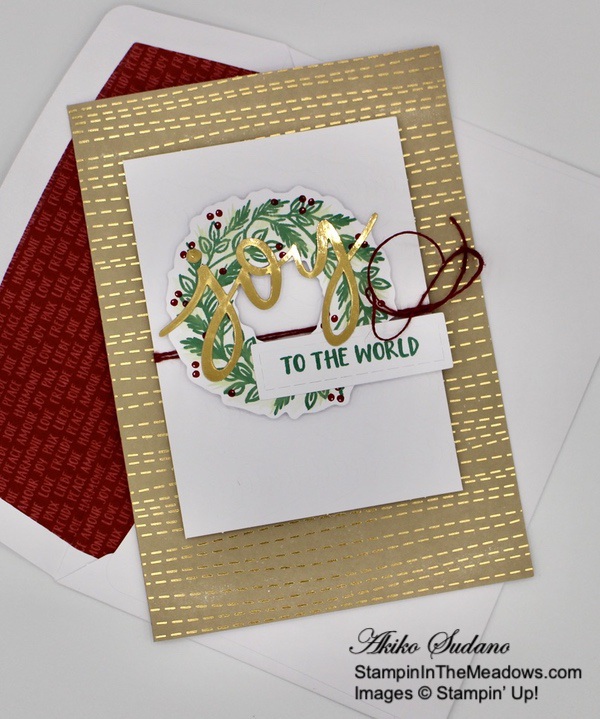 I mixed things up with this last card. I turned it into a Thanks card with the sentiment from the Simply Succulents cling stamp set in Merry Merlot, gold trim bow instead of Mossy Meadow and a Rococo Rose sequin instead of black. Isn’t the gold floral doily beautiful!!