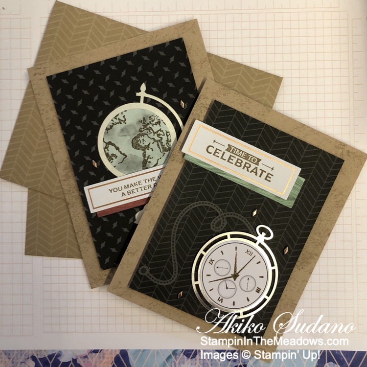 We got to make some cards too! We made these wonderful cards using the new Timeless Greetings Kit! This is a new kit that will be available tomorrow and is perfect for masculine cards. The all inclusive kit makes eight 4-1/4″ x 5-1/2″ cards, four in each of these designs. A n exclusive stamp set and Early Espresso Stampin’ Spot, instructions and all needed adhesives are included.