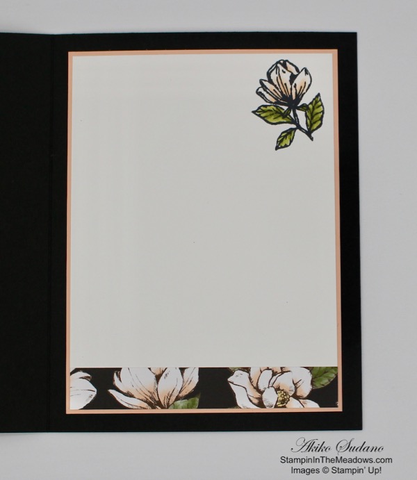 For the inside of the card, I inked up the floral cluster stamp from the Stampin’ Up! Framed Florets stamp set in Melon Mambo ink and stamped off twice before stamping on a Basic White panel. I stamped the sentiment over the floral cluster in Evening Evergreen ink and trimmed the bottom with a strip of Fitting Florets DSP before adhering it to the inside of the card with Stampin’ Seal.