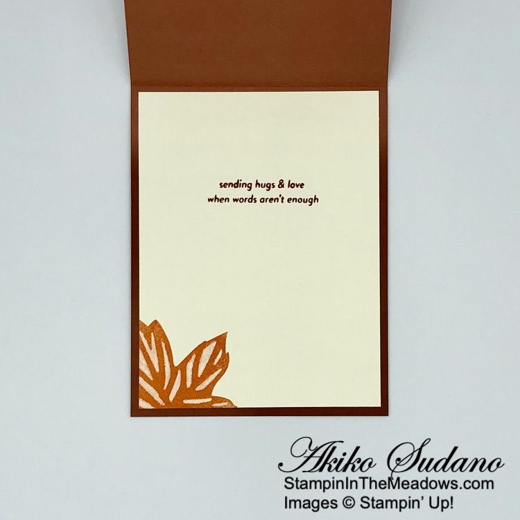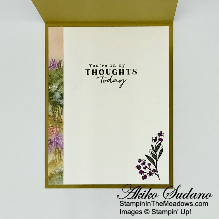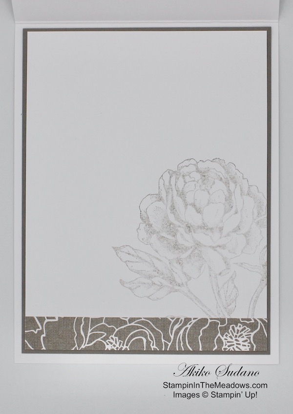 For the inside of the card, I stamped the plant outline from the Stampin’ Up! Splendid Thoughts stamp set in stamped off Soft Succulent ink on a Basic White panel. I stamped the solid leaf over it in stamped off Pool Party ink and trimmed the bottom with a strip of Texture chic DSP. I adhered the panel to the inside of the card with Stampin’ Seal.