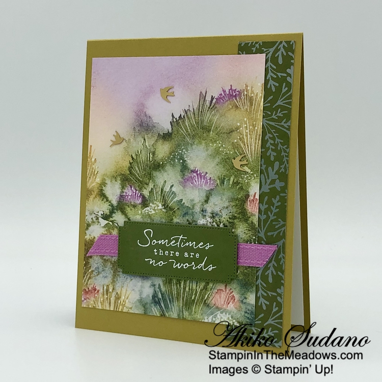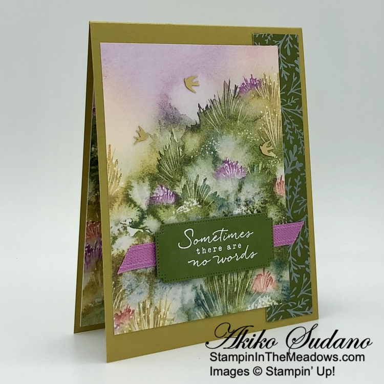 I cut the large fern die from the Forever Flourishing dies from a Soft Succulent and gold panel of Texture Chic DSP and adhered it to the card with dots of liquid glue. I cut the large leaf die from the Stampin’ Up! Splendid Thoughts bundle using Evening Evergreen card stock and adhered it to the card front with glue dots. I used the small die to cut a Sot Succulent panel and adhered it with glue dots. I left some inside pieces in some of the leaves on purpose for added texture.