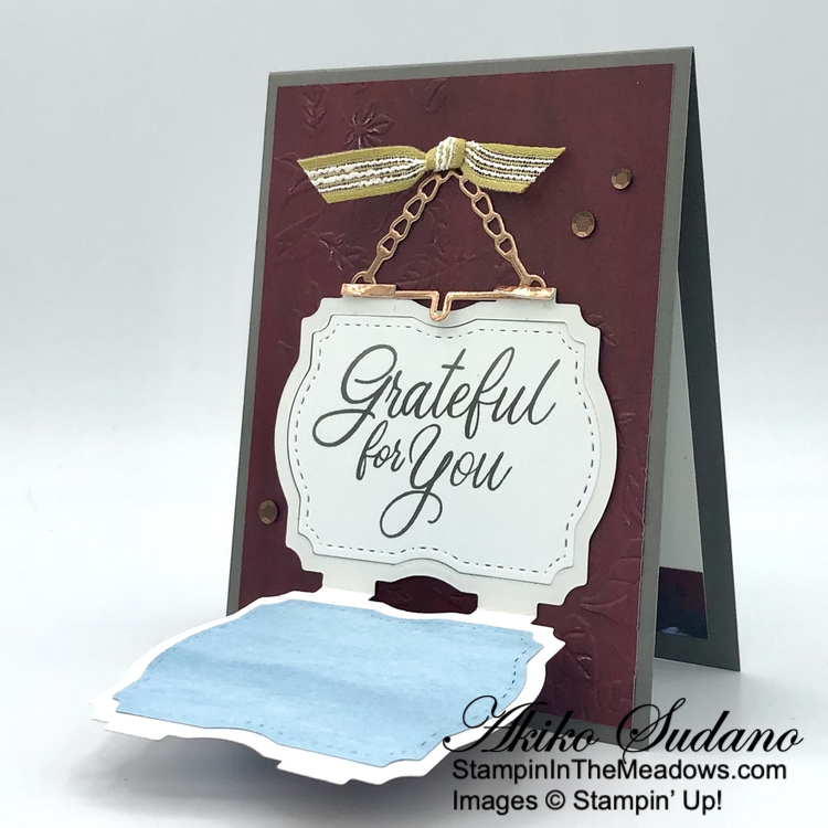 Stamp the sentiment from the Stampin’ Up! Gathering Moments stamp set on Basic Beige using Early Espresso ink. Cut it out with the small angled Traditional Labels dies and adhere it to the card with glue dots. Fold a length of irregular weave ribbon and adhere it to the card with glue dots.