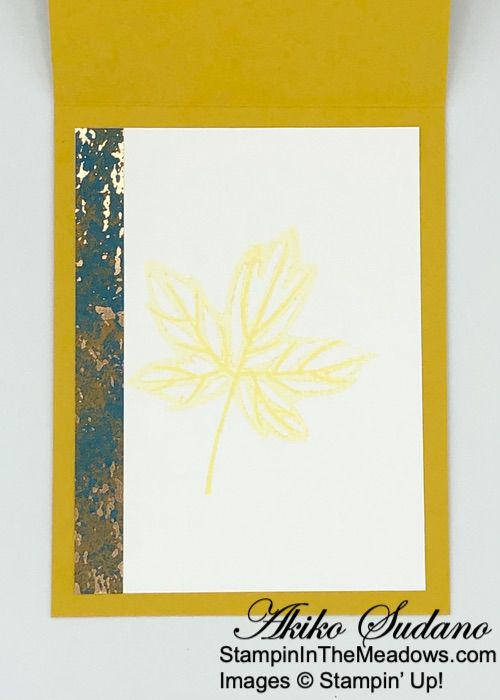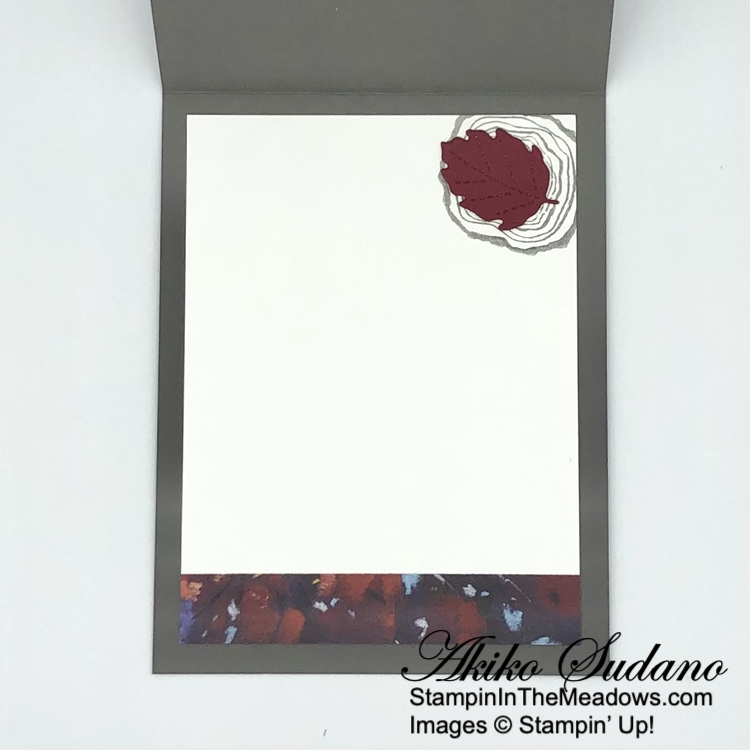 - Gathering Together DSP – 4-1/4″ x 5-1/2″ (front background), 2-3/4″ x 4″ (leafy DSP panel), 2-1/2″ x 2-1/2″ (die cut circle), 1/2″ x 3-3/4″ (inside trim)