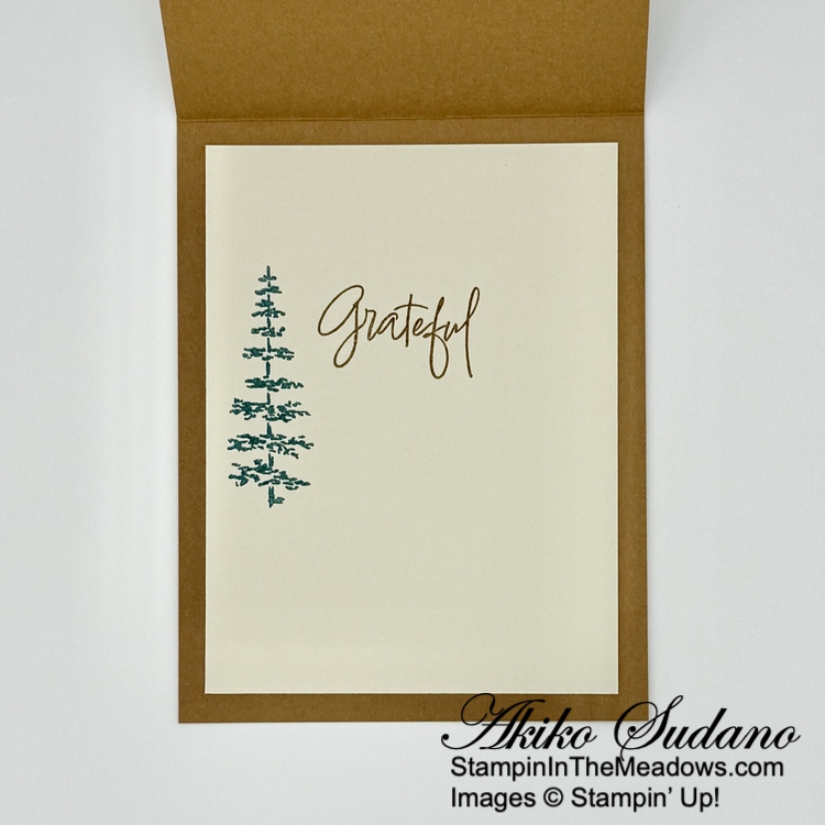For the inside, stamp the leaf and berries from the Stampin’ Up! Gathering Moments stamp set using Cajun Craze and Early Espresso inks in the corner of a Basic White panel. Trim the bottom with DSP and adhere the panel to the inside of the card with Stampin’ Seal.