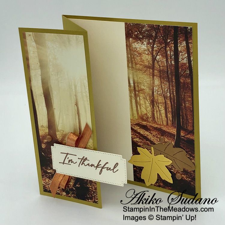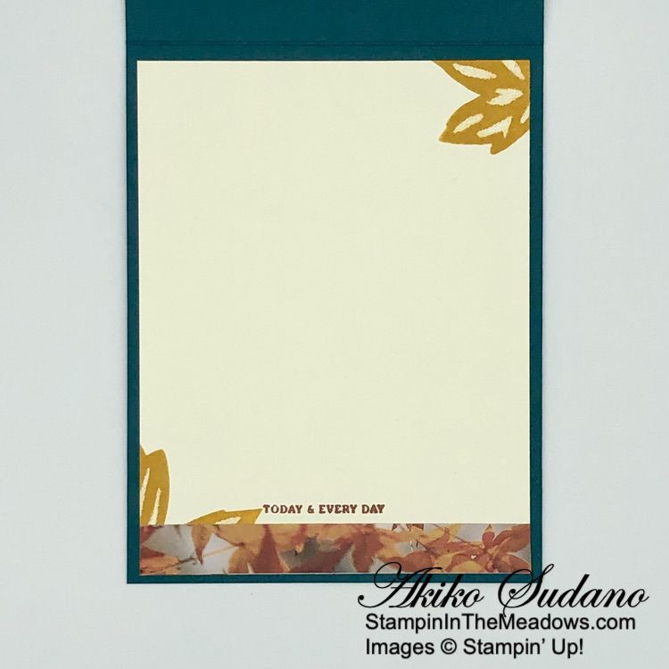 For the inside of the card I stamped the the leaf from the Stampin’ Up! Iconic Imagery stamp set in Mossy Meadow ink in the top corner of a Basic Beige panel. I trimmed the bottom with a strip of DSP and adhered the panel to the inside of the card with Stampin’ Seal.
