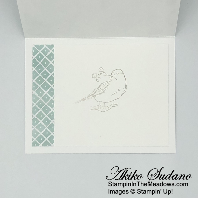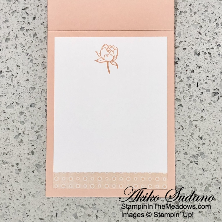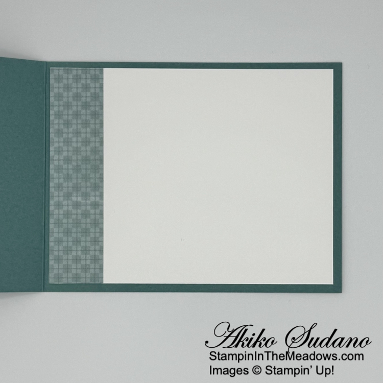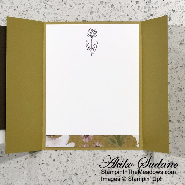 For the inside, stamp the flourish from the Stampin’ Up! Beautiful Motifs stamp set on a Basic White panel using stamped off Crumb Cake ink. Trim the bottom with DSP and adhere it to the inside of the card with Stampin’ Seal.
