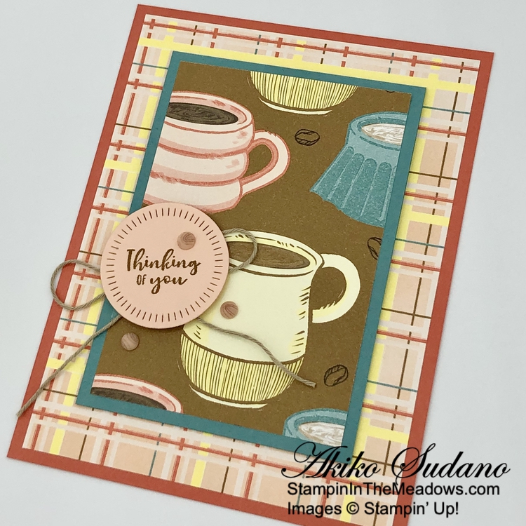 I stamped the sentiment from the Stampin’ Up! Winterly Tree Tops stamp set in Memento Tuxedo Black ink on Basic White. I wrapped a length of black baker’s twine around one end and tied a bow. I adhered the label to the card with dimensionals and finished the card with Moody Mauve dots.