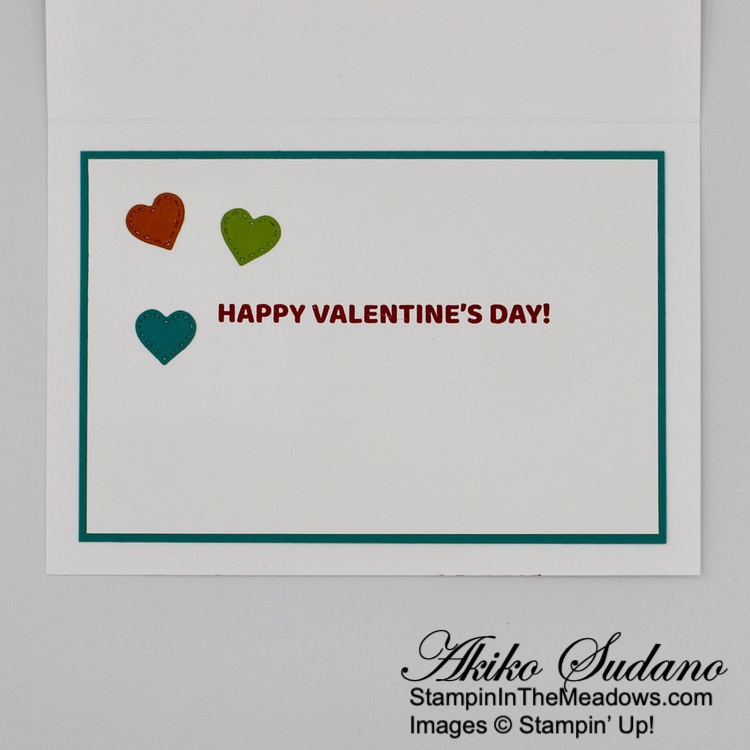 For the inside of the card, I stamped the sentiment from the Stampin’ Up! Bee My Valentine stamp set in Sweet Sorbet on Basic White. I stamped the flower in Petal Pink and the stem in Lemon Lime Twist and adhered the panel to the inside of the card with liquid glue. I closed the card to make sure the inside panel is covered when the card is closed – good thing liquid glue gives you wiggle room to move things a bit if needed!