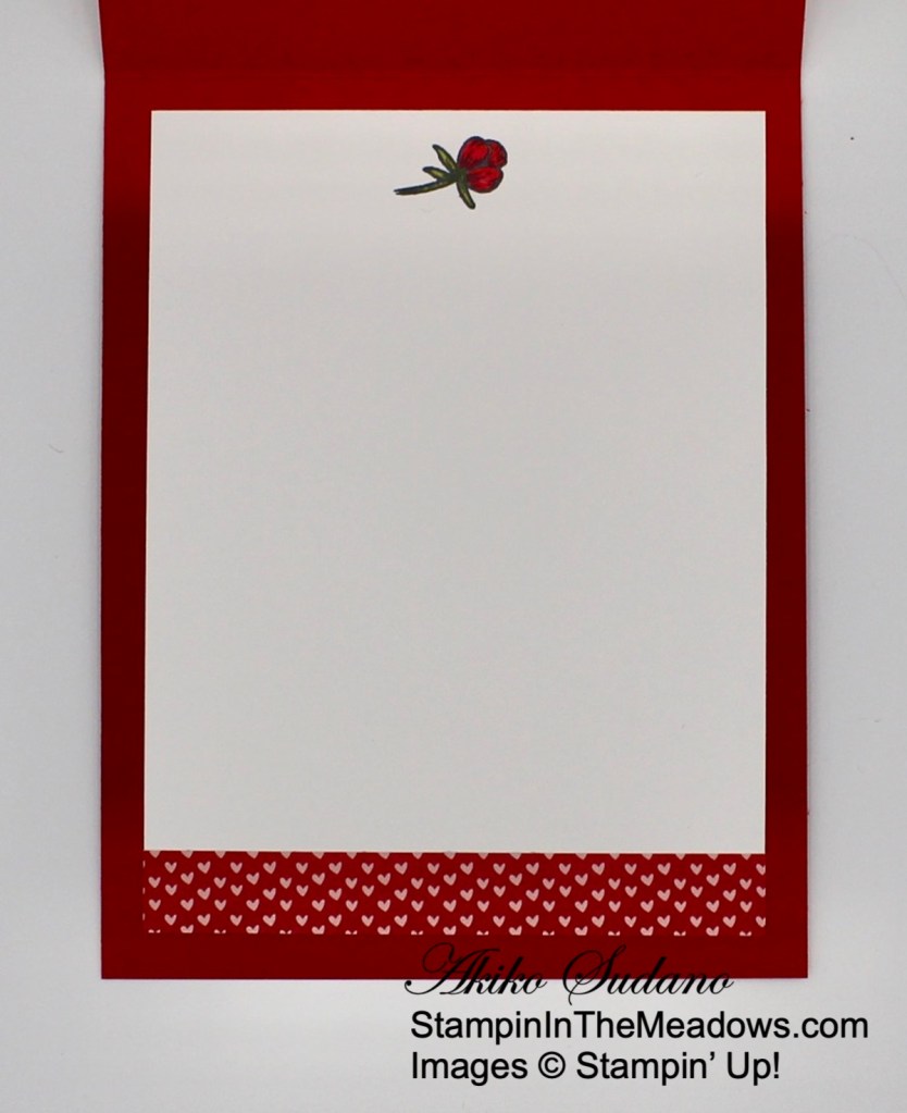 On a Basic White panel, I stamped the sentiment from the Stampin’ Up! Heart To Heart stamp set in Rococo Rose. I stamped the flower in Blushing Bride, the stem in Pear Pizzazz and heart in Rococo Rose. I adhered the panel to the inside of the card.