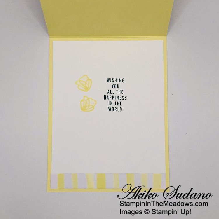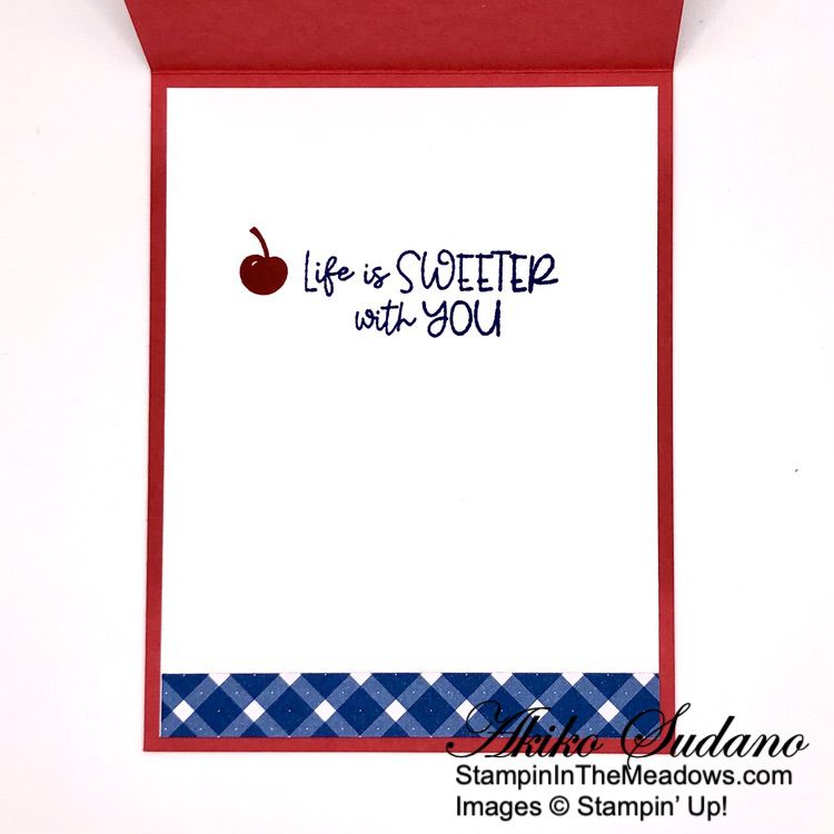 For the inside of the card, I stamped the sentiment from the Stampin’ Up! Share A Milkshake stamp set in Blueberry Bushel on a Basic White panel. I stamped a cherry next to the sentiment in Real Red ink and trimmed the bottom with a strip of Glorious Gingham DSP. I adhered the panel to the inside of the card with Stampin’ Seal.