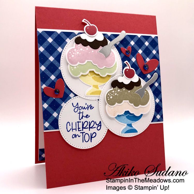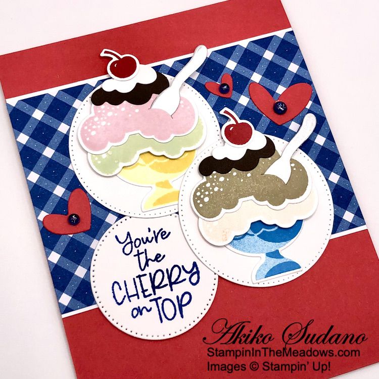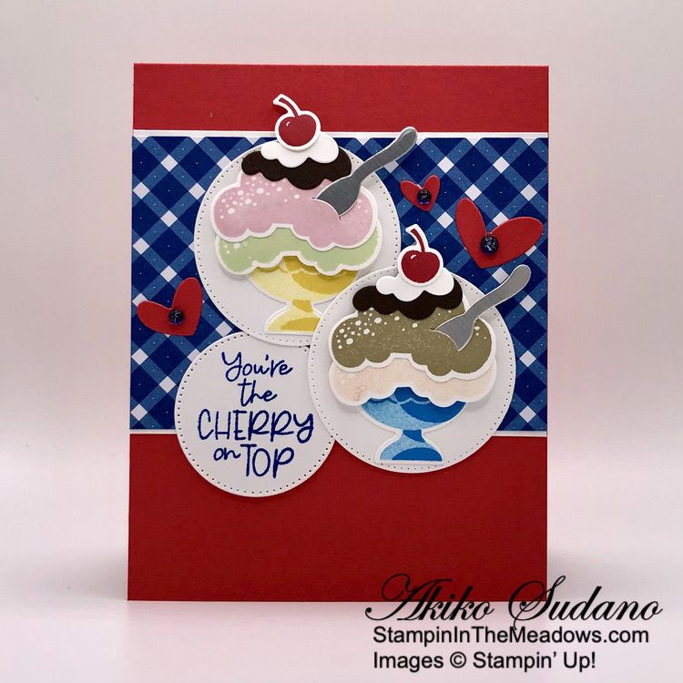 I adhered a panel of Blueberry Bushel Glorious Gingham 6″ x 6″ designer series paper to a Basic White mat and then to the front of a Sweet Sorbet card base with liquid glue. I two circles using the Stylish Shapes dies for my ice cream dishes. I stamped two ice cream dishes using the Stampin’ Up! Share A Milkshake stamp set in Daffodil Delight and Azure Afternoon on Basic White. I stamped the detailed stamp using full strength ink and stamped off before stamping the filler stamp. I cut them out with the coordinating dies and adhered them to the die cut circles with liquid glue.