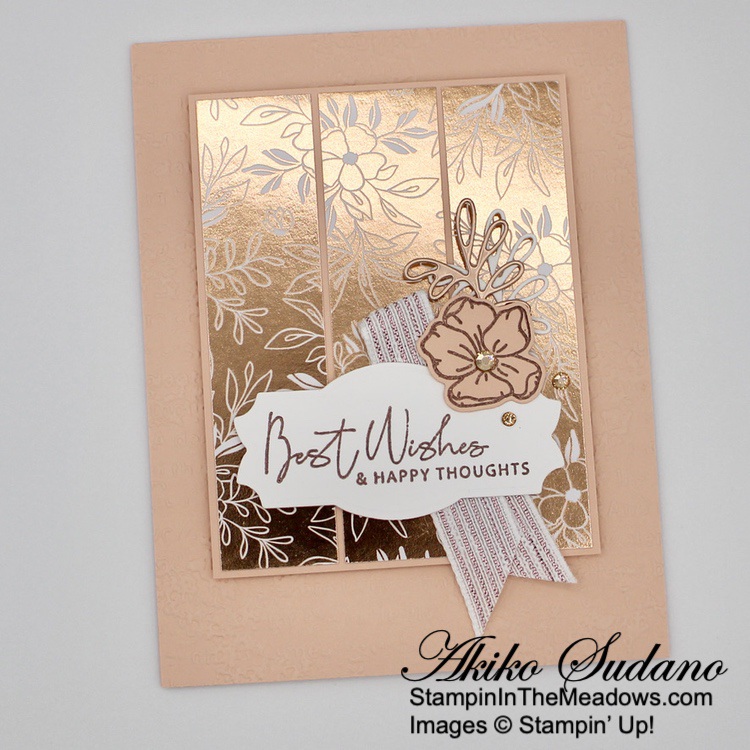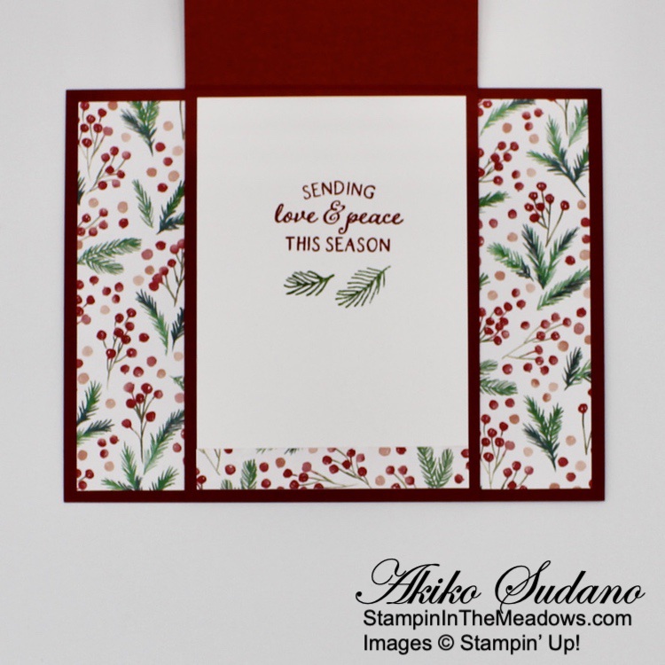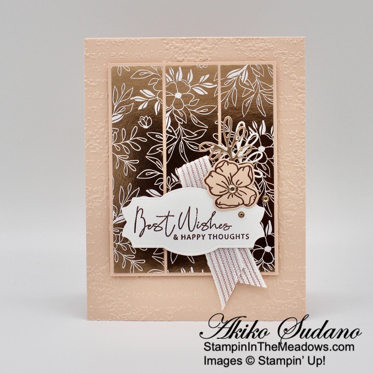 I wrapped the card front twice with Linen Thread and made a loopy bow. I stamped the sentiment from the Stampin’ Up! Dainty Delight stamp set on a Crumb Cake panel in Evening Evergreen ink. I trimmed the end and adhered the label to the card front with dimensionals. I finished the card front with three brushed gold butterflies.