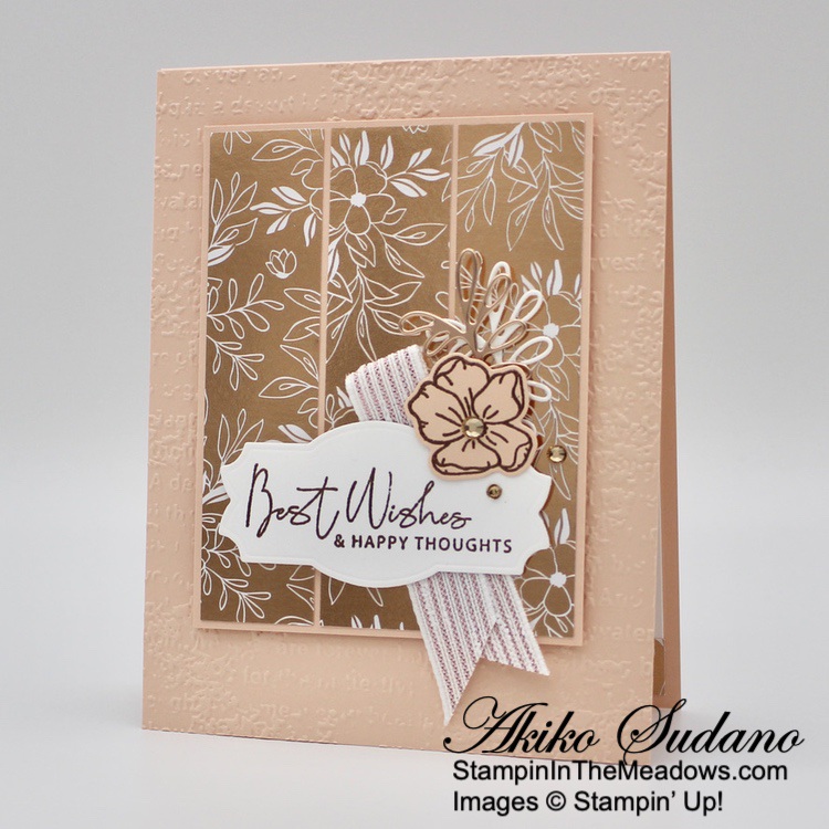 I embossed the stamped panel with the Painted Posies 3D embossing folder and adhered it to a Crumb Cake mat with liquid glue. I adhered the layered panel to the card front with liquid glue.