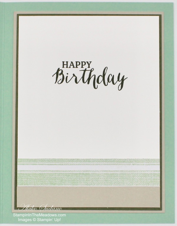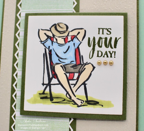 I adhered the layered art panel on the card front with dimensionals. I stamped the sentiment from the Stampin’ Up! A Good Man stamp set in Memento Tuxedo Black ink on Sahara Sand and cut it out with the smallest Layering Circle Die. I used the smallest stitched shape die to cut another circle from Basic Black ink and adhered the sentiment to it. I adhered it to the card front with dimensionals and liquid glue under the art panel. I finished card front with three Designer Elements.