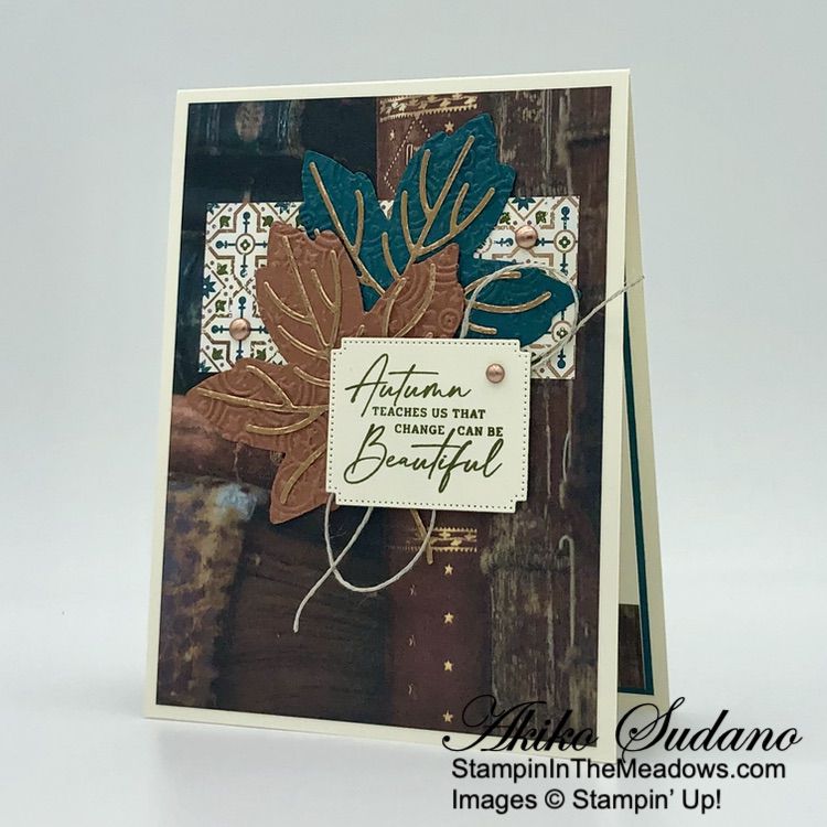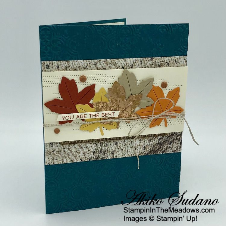I used the dies from the Stampin’ Up! Autumn Leaves dies to cut a small Lemon Lolly maple leaf and two small copper clay leaves. I adhered the leaves to the card with glue dots.