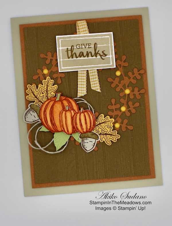 Good Morning! Today I’m sharing a clean and simple card made with the Stampin’ Up! Beautiful Autumn bundle accented with leaves and acorns punched from the beautiful Gilded Autumn specialty designer series paper. You can find the supplies used to create this card at the bottom of my post along with the sizes of cardstock used.