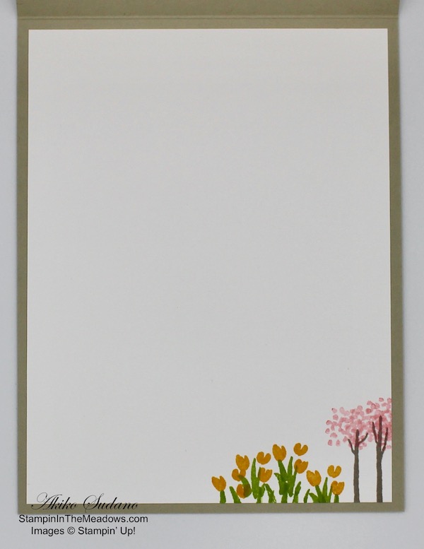 I stamped the flowers from the Stampin’ Up! Art Gallery and Beautiful Friendship stamp sets in Blushing Bride, Bumblebee, Terracotta Tile and Shaded Spruce on a Whisper White Panel. I adhered the panel to a So Saffron mat and the to the inside of the card.