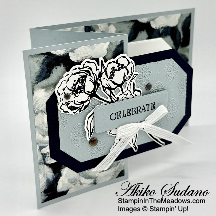 Adhere a panel of the Beautiful Gallery 6″ x 6″ designer series paper to a Crumb Cake mat and wrap it three times with Crumb Cake baker’s twine, tying a knot. Pop the panel on the front of a Misty Moonlight card base using dimensionals.