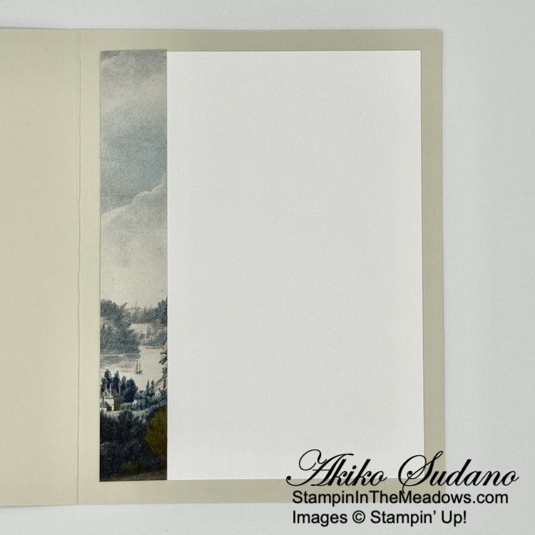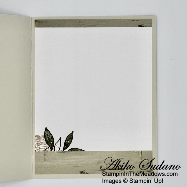 For the inside panel, stamp the wildflower from the Gallery Blooms stamp set using Misty Moonlight ink in the corners of a Basic White panel. Trim the bottom with DSP and adhere the panel to the inside of the card with Stampin’ Seal.