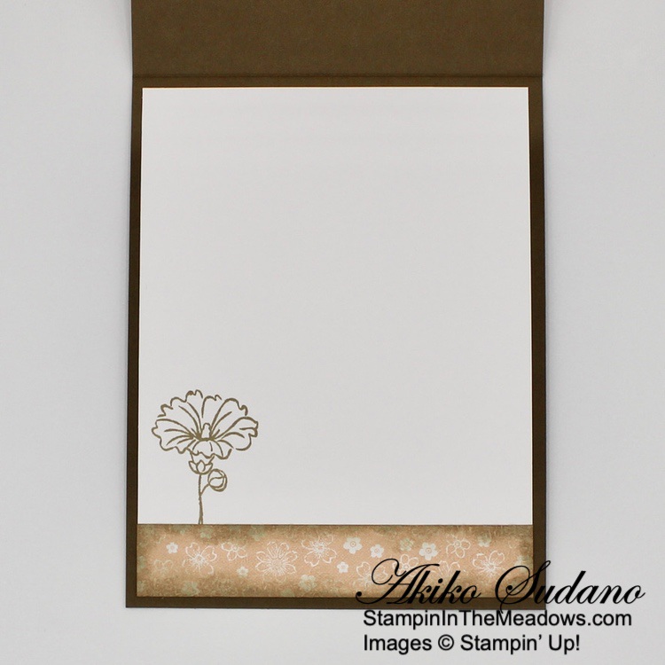 For the inside of the card, I stamped the flower from the Stampin’ Up! Beautifully Happy stamp set in Memento Tuxedo Black ink on a Basic White panel. I stamped the filler flower in Sweet Sorbet and the leaves in Granny Apple Green. I colored the center with the dark Pale Papaya Stampin’ Blend and adhered a strip of Lovely Linen DSP to the bottom. I adhered the panel to a Pale Papaya mat and adhered it to the inside of the card with liquid glue.