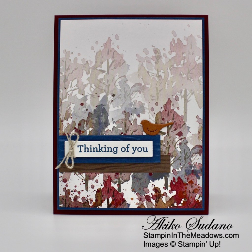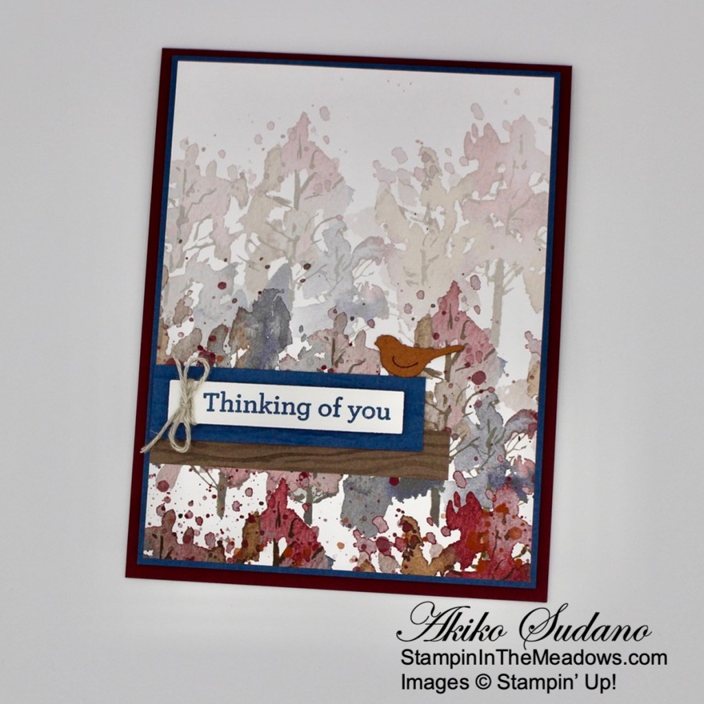 For the inside of the card, I stamped the tree trunk from the Stampin’ Up! Beauty of Friendship stamp set on the side of a Basic White panel in stamped off Early Espresso ink. I stamped the detailed tree top in stamped off Misty Moonlight, Merry Merlot and full strength Crumb Cake, so that it would have a multi-color look. I stamped the sentiment in Misty Moonlight ink and adhered the other bird to the tree. I adhered a strip of Beauty of the Earth DSP to the bottom of the panel and adhered the panel to the inside of the card.