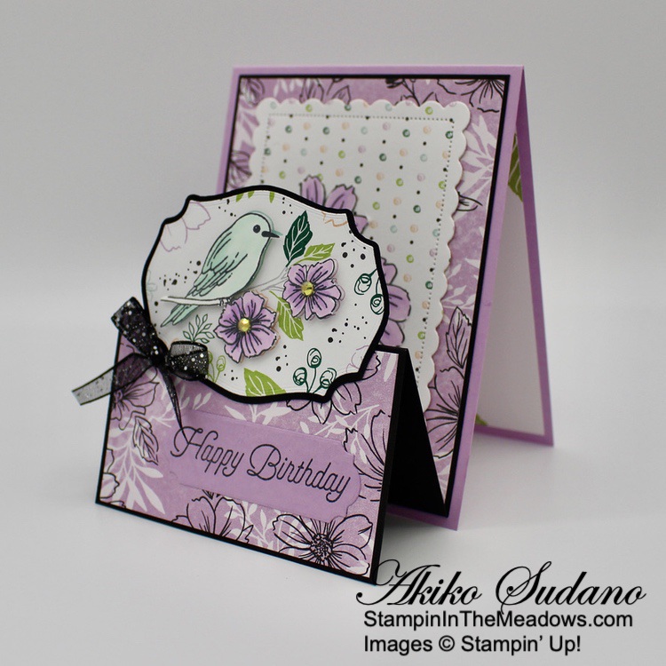 - Pansy Petals DSP – 4″ x 5-1/4″ (inside panel), two 2-1/2″ x 4″ panels (front panels), small die cut pansy, two evening evergreen die cut leaves