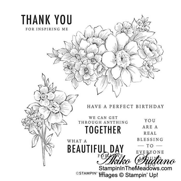 I stamped the large bouquet from the Stampin’ Up! Blessings of Home cling stamp set in Memento Tuxedo Black ink on a Basic White panel and cut it out with the coordinating die. I colored the flowers and leaves with Stampin’ Blends, doing some light shading with a lot of help from the stamp shading. I used Soft Succulent on the leaves, Real Red, So Saffron, Soft Suede, Fresh Freesia and Pale Papaya on the flowers. I used some light Smoky Slate to accent the shade marks on the large white flowers. I made a loopy Bow with white crinkle ribbon and cut lengthwise a length of Evening Evergreen ribbon and tied it. I adhered the ribbon to the card front with glue dots and popped the flowers on top with dimensionals.
