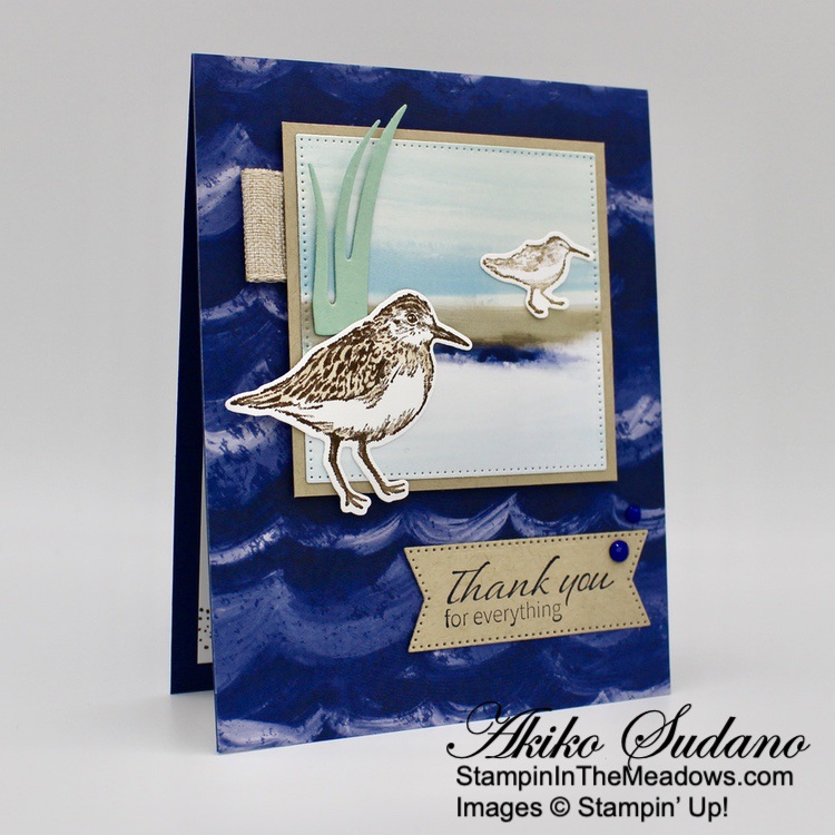 I adhered a panel of By the Bay 6″ x 6″ Night of Navy specialty designer series paper to the front of a soon to be retired Sahara Sand card stock – I love the iridescent waves in this design. I adhered another panel to a Sahara Sand mat and stamped three flying seagulls from the Waves of Inspiration cling stamp set in Night of Navy ink. I wrapped Linen Thread around the panel three times and made a knot and adhered it to the card base with dimensionals.
