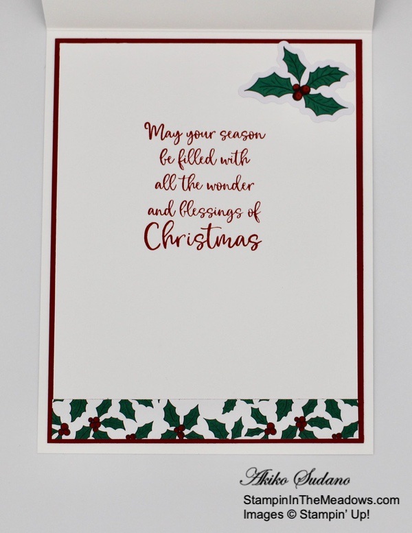 For the inside, adhere a strip of Feels like Frost 6″ x 6″ DSP to the side of a Whisper White panel. Stamp the pine branches from the Stampin’ Up! Cherish The Season stamp set in the corners using Seaside Spray ink and lightly color with Purple Posy Stampin’ Blends. Stamp the sentiment in Misty Moonlight ink and adhere the panel to the inside of the card.