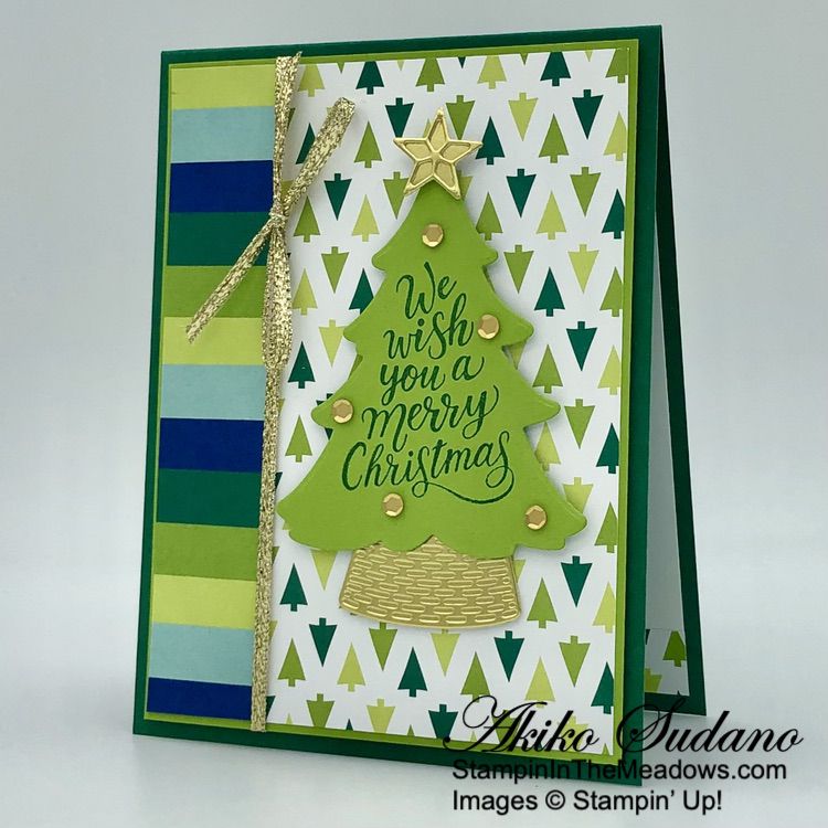 Good Morning! The Stampin’ Up! Merriest Trees bundle is a wonderful Christmas Tree stamp set set that is so versatile and fun! I paired it with the Merry Bold and Bright designer series paper for a modern Christmas Card in different shades of green and gold. You can find the products I used at the bottom of my post along with the card stock sizes.