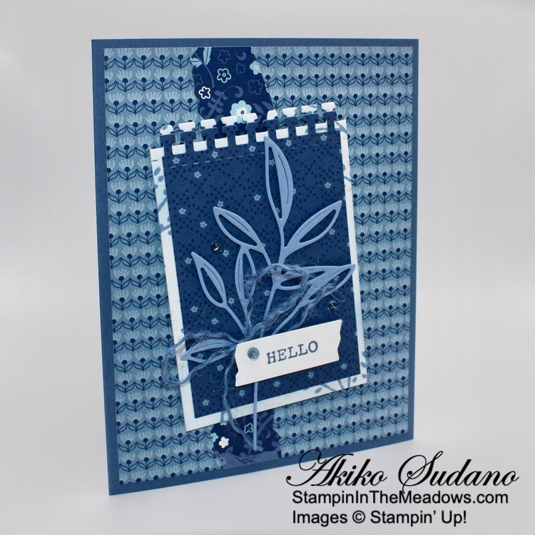 I adhered a panel striped panel of the retiring Countryside Inn designer series paper to a Misty Moonlight mat with liquid glue. I adhered it to a floral panel of the Countryside Inn DSP and then adhered the layered DSP to the front of a Boho Blue card base. Boho Blue is one of the retiring 2023-3035 In Colors.