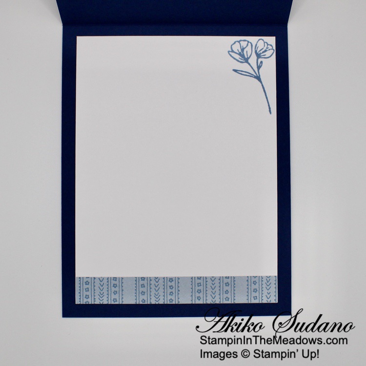 For the inside of the card, I stamped a flower cluster from the Country Birdhouse stamp set using Memento Tuxedo Black ink in the corner of a Basic White panel and colored it with Boho Blue and Night of Navy Stampin’ Blends. I stamped the sentiment from the Flower Card stamp set in Memento Tuxedo Black ink and trimmed the side with DSP. I adhered the panel to the inside of the card with Stampin’ Seal.