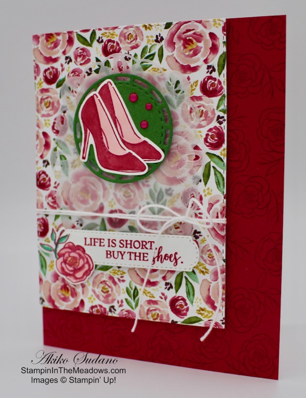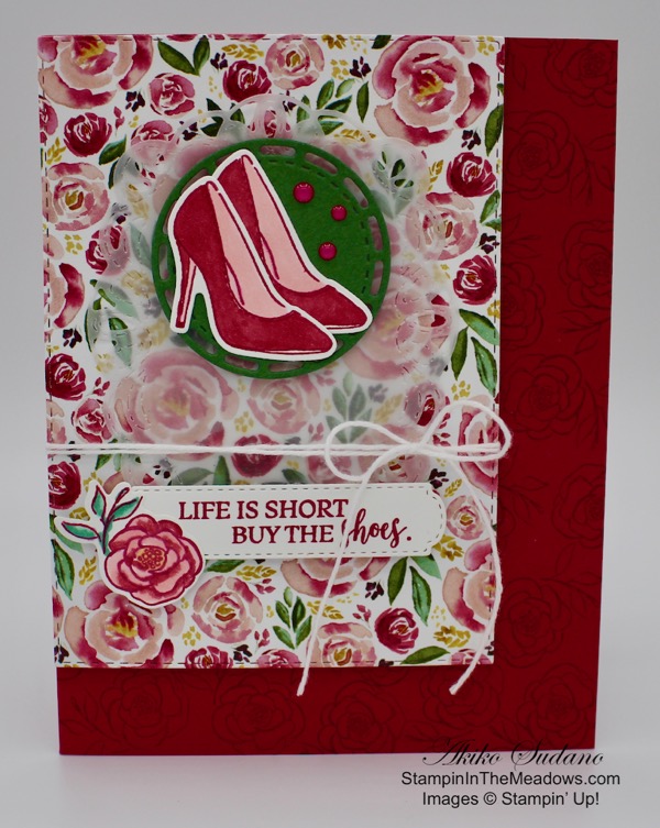 I stamped two shoes, the perfume bottle and the lipstick from the Stampin’ Up! Dressed To Impress stamp set in Memento Tuxedo Black in on Whisper White and cut them out with the dies from the All Dressed Up Dies. I colored the shoes with Light Purple Posey, Light Petal Pink and Dark Blackberry Bliss Stampin’ Blends and glued them together. I colored the lipstick with Light Basic Black, Light and Dark Smoky Slate and Light and Dark Lively Lipstick Stampin’ Blends. I colored the perfume bottle with Light Pretty Peacock, Light So Saffron and Light Pool Party Stampin Blends. While coloring with the Stampin’ Blends, I used the color lifter to add highlights. I adhered the layered shoes, perfume bottle and lipstick to the circle with dimensionals. I added a Daffodil Delight ruched ribbon bow with a glue dot to finish the card front.