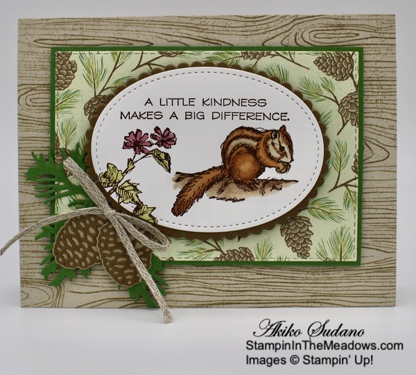 Cut out the medium bough from the Beautiful Boughs dies from Garden Green card stock. Cut out the pine cones – two detailed small pinecones from Soft Suede and two solid pinecones from Crumb Cake. Adhere the pinecones together and adhere the bough and layered pinecones to the lower corner of the panel. Stamp the chipmunk, plant and sentiment from the Stampin’ Up! Field Journal stamp set in Early Espresso ink on a Whisper White panel. Cut it out with the large oval die from the Stitched Shapes Dies.