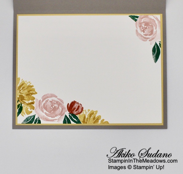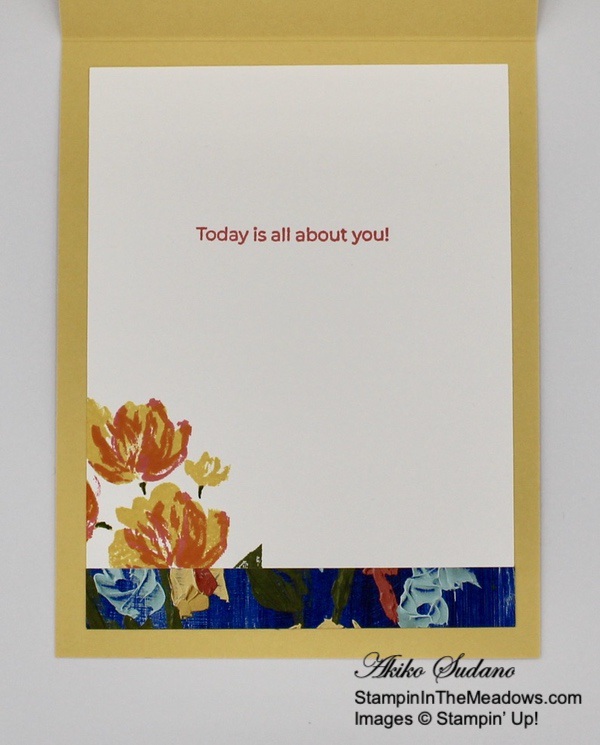 For the inside of the card, I adhered the floral DSP to the Pool Party card stock and adhered them both to the side of a Basic White panel. I adhered the panel to the inside of the card.