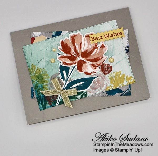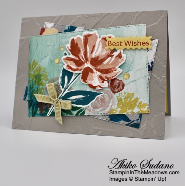 I cut the Golden Garden acetate so that it matches the pattern in the Fine Art Floral designer series paper and I peeled off the protective backing on the acetate and adhered it to the floral DSP with Stampin’ Seal under the Basic White rectangle. I adhered the Pool Party texture paper to a Pool Party mat and then adhered the layered floral paper next to it. I adhered the panel to the front of a Poppy Parade card base.
