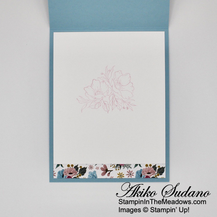 For the inside of the card, I stamped the two flower stamp from the Stampin’ Up! Framed Florets stamp in stamped off Polished Pink on a Basic White panel. I trimmed the bottom of the panel with a strip of Fitted Florets DSP and adhered the panel to the inside of the card with Stampin’ Seal.