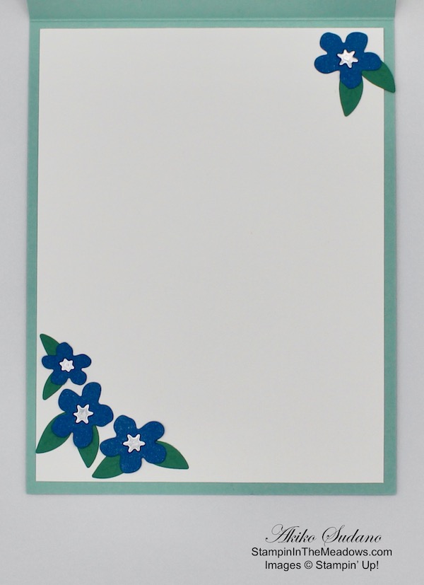 I saved a couple of flowers and leaves for a Whisper White panel on the inside of the card, adding silver foil centers to the flowers.