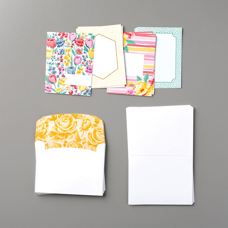The last card was the simplest! I trimmed a Flowers for Every Season Memories and More card pack card by 1/16″ on all sides and adhered it to a Cinnamon Cider mat (cut to 3″ x 4″). I used this card because it has the same design as the envelope liner, as well as a sweet sentiment. I decorated it with 3 Bumblebee enamel dots and popped it on another white Flowers for Every Season Cards and More card base with dimensionals.