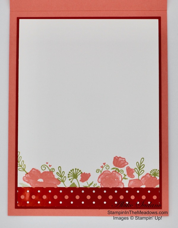 For the inside of the card, I added a strip of the From My Heart designer series paper to the bottom of a Whisper White panel. I stamped two Real Red and a Flirty Flamingo heart from the Stampin’ Up! Heartfelt stamp set in the corner. I adhered the panel to the inside of the card with snail.