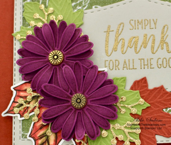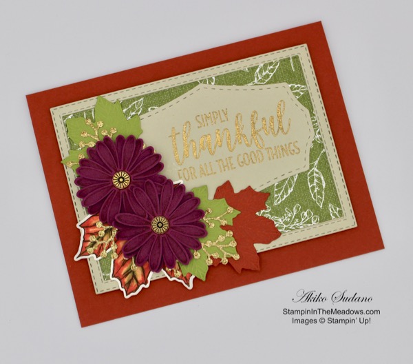 Our theme for this month is Giving Thanks and I’ve made a card using the Stampin’ Up! Daisy Lane stamp set and the wonderful sentiment from the Stampin’ Up! Country Home stamp set. These daisies remind me of the purple mums that are all over the place at this time of year and make me feel like Fall. You can find the supplies used to create this card at the bottom of my post along with the sizes of cardstock used.