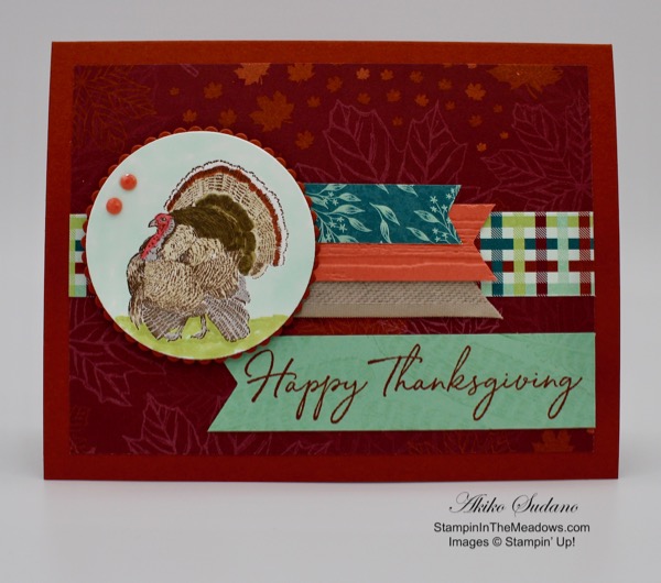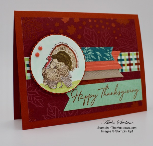 Good Morning! Today I am sharing a Thanksgiving Card made with the Stampin’ Up! Day of Thanks stamp set. This turkey looks just like the one on the Thanksgiving turkey platter that I have been using for 40 years, so I just had to get the set because it is a real traditional Thanksgiving turkey! You can find the supplies used to create this card at the bottom of my post along with the sizes of cardstock used.