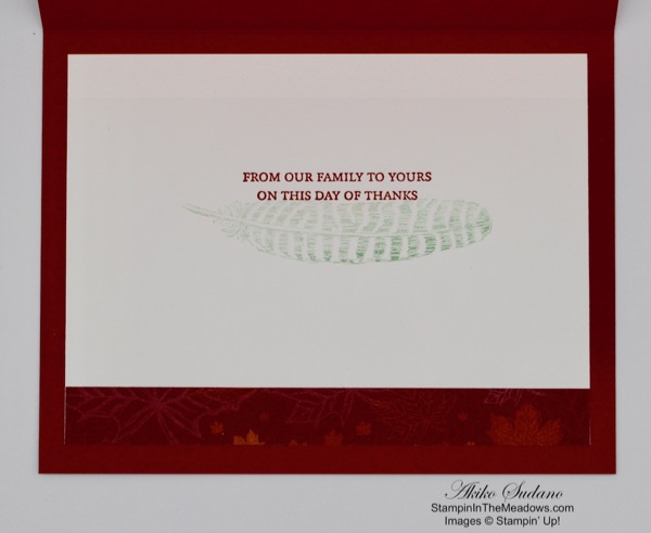 On the inside of the card, I added a strip of the Merry Merlot paper to the bottom of a Whisper White panel and stamped the sentiment in Cajun Craze. I also stamped another feather in Mint Macaron, after stamping off twice.