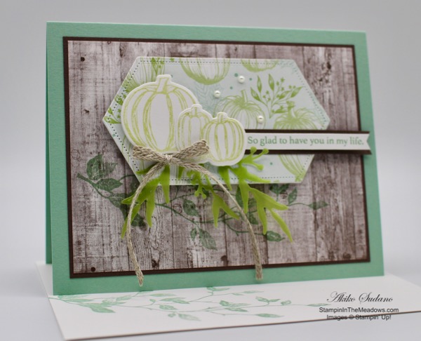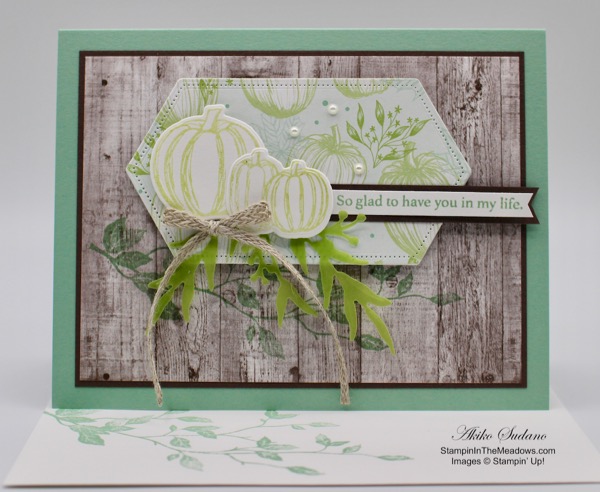 Good Morning! Today’s card is another fall card using the wonderful Stampin’ Up! Gather Together photopolymer stamp set. This is an autumn friendship card with pumpkins and vellum leaves and the sweet sentiment So glad to have you in my life from the Gather Together stamp set. You can find the supplies used to create this card at the bottom of my post along with the sizes of cardstock used.